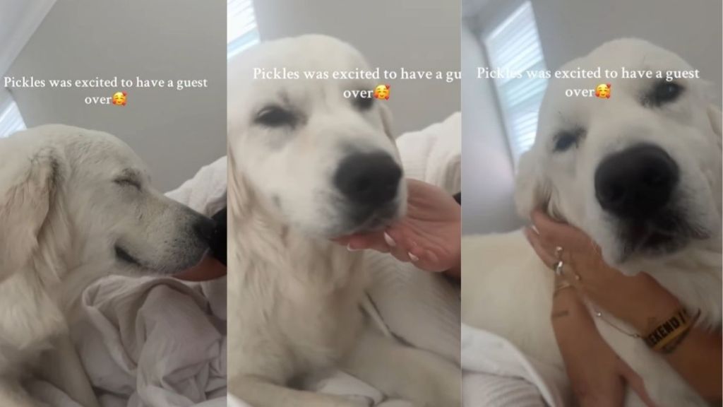 Golden Retriever fans will love this sweet sleepover clip. Pickles, an English Cream Golden Retriever, wakes up glowing because Mom’s friend stayed the night. The reel, posted by @lexiwolfiepickles, shows the pup soaking up attention while Mom talks in a playful baby voice.