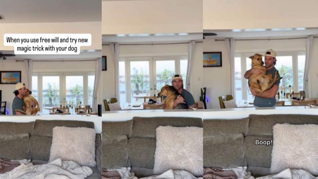 Mike and Cactus are turning their living room into a stage for some pretty fun hobbies. They regularly post their antics on @cactustherescue, and things just got very imaginary. In this video, we see the rescue pup helping his dad with a strange magic trick behind the couch. They start by walking down a set of stairs that don’t actually exist. Then they ride an elevator back up into view. Cactus stays totally in character the whole time. He just goes with the flow while Mike handles the heavy lifting. It’s a lot of pretending for a dog, but Cactus is a star.