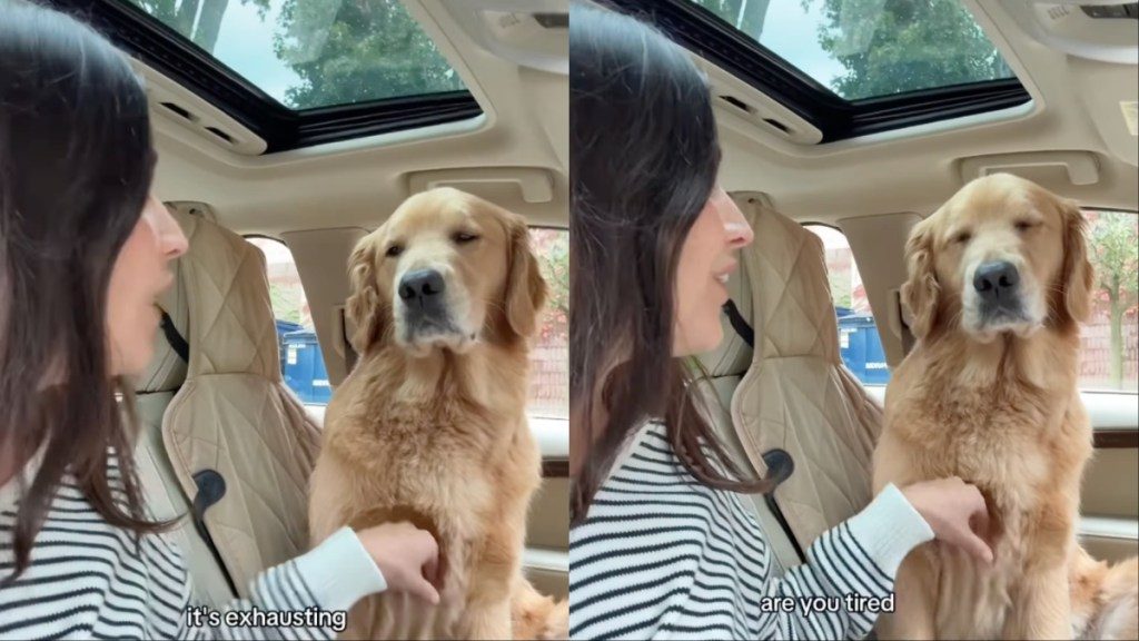 This back-and-forth between a tired pup and a mom who knows exactly what he was up to all day is too funny to miss. A Golden Retriever named Harold, aka Harry, is sitting in the passenger seat after a long stint at daycare. Meanwhile, the pet parent is busy spilling all the tea on his behavior while she gives him chest scritches.