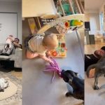 When her owner enters the room, Martha keeps her head low and looks at her owner with a calm expression, almost as if she cannot be bothered to react. But her tail tells the real story. While the rest of her body stays still, Martha’s tail whips back and forth so fast it looks like a spinning fan. She continues to act nonchalant, yet the wag gives her away completely.
