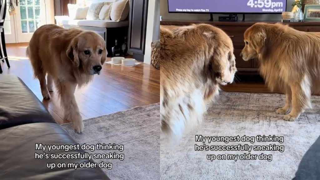 Dog’s technique to sneak up on older furry sibling is hilarious